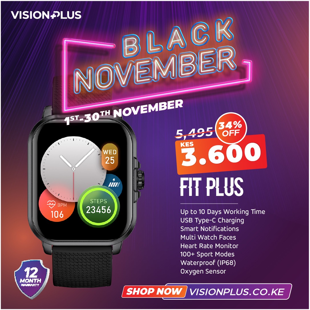 Maximize your fitness with Vision Plus Fit Plus Smartwatch. Enjoy up to 10 days of power, waterproof design (IP68), and essential health features. With 100+ sport modes, customizable watch faces, and smart notifications via Bluetooth, Fit Plus is the ultimate blend of style and functionality.